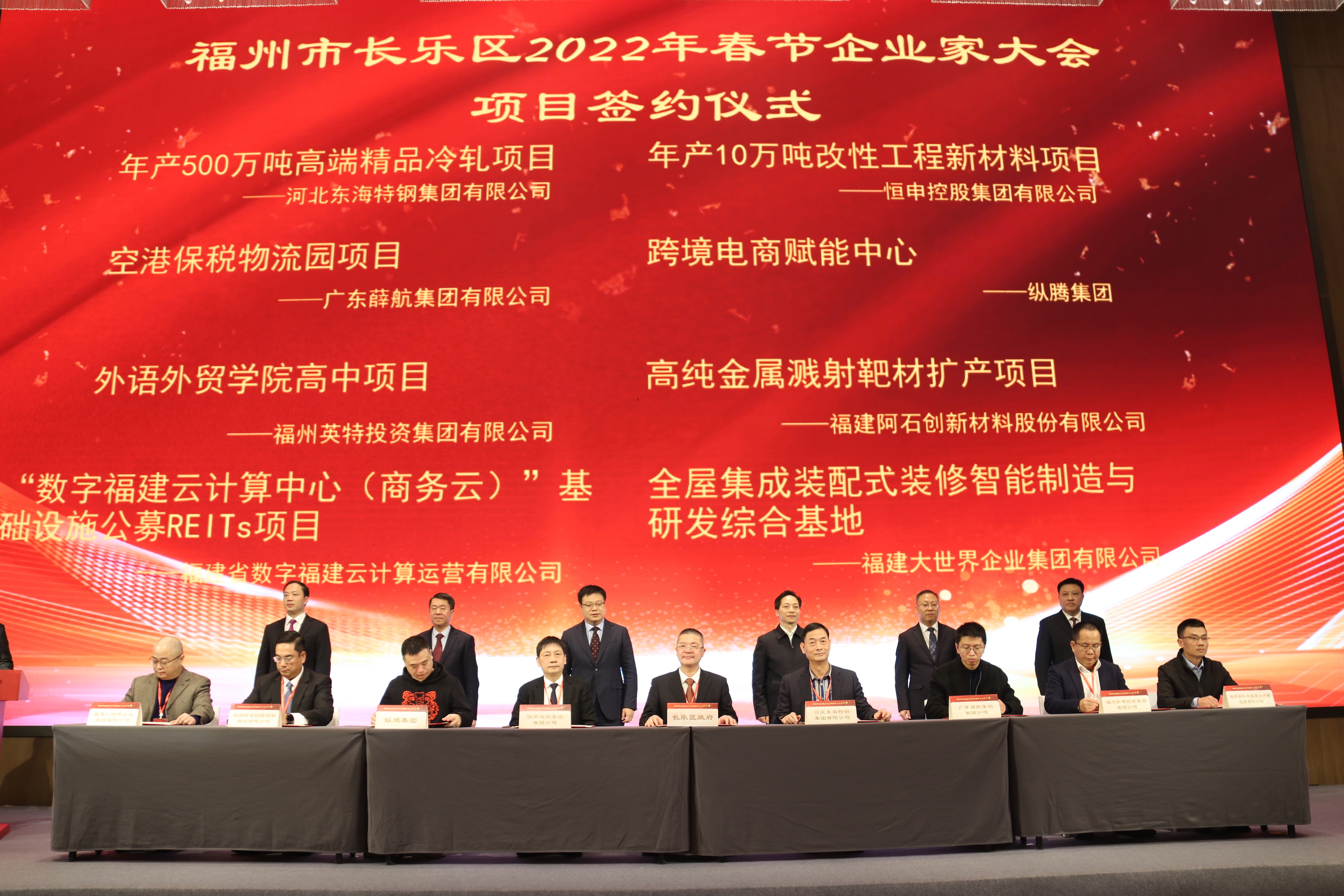 项目签约是本次企业家大会的“重头戏”。与会企业现场签署了一批涉及领域宽、覆盖范围广、基础作用大、示范效应强的合作协议,总投资额达238.3亿元,其中河北东海特钢集团有限公司签署“年产500万吨高端精品冷轧项目”,助力推进长乐经济社会更好更快发展。